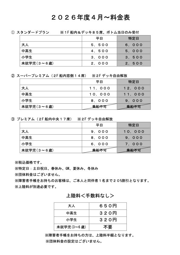 なお、2026年度より乗船料と、島の上陸料の改定がございます。