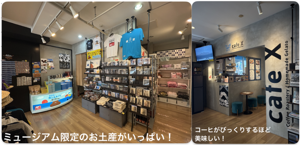 受付と軍艦島コンシェルジュ自慢のCafe X、そして軍艦島のオリジナルグッズを揃えた